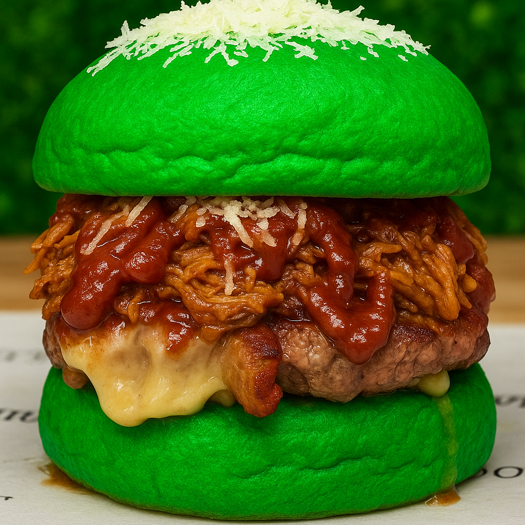Carne de chuletón, queso ahumado, ⁠⁠mermelada de bacon, pulled pork, salsa ketchup casero, ⁠⁠topping de queso parmesano