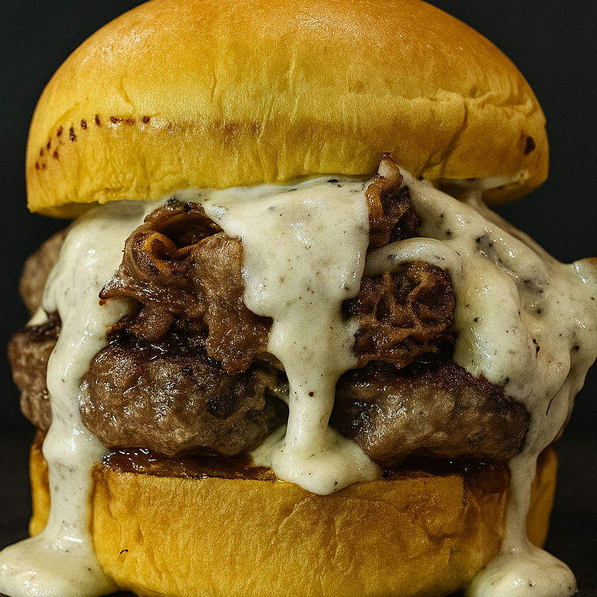 Pan brioche de masa madre, dos discos de 90gr cada uno smasheados de carne picada de chuletón madurada, queso ahumado, cebolla caramelizada y mayo sweet chili