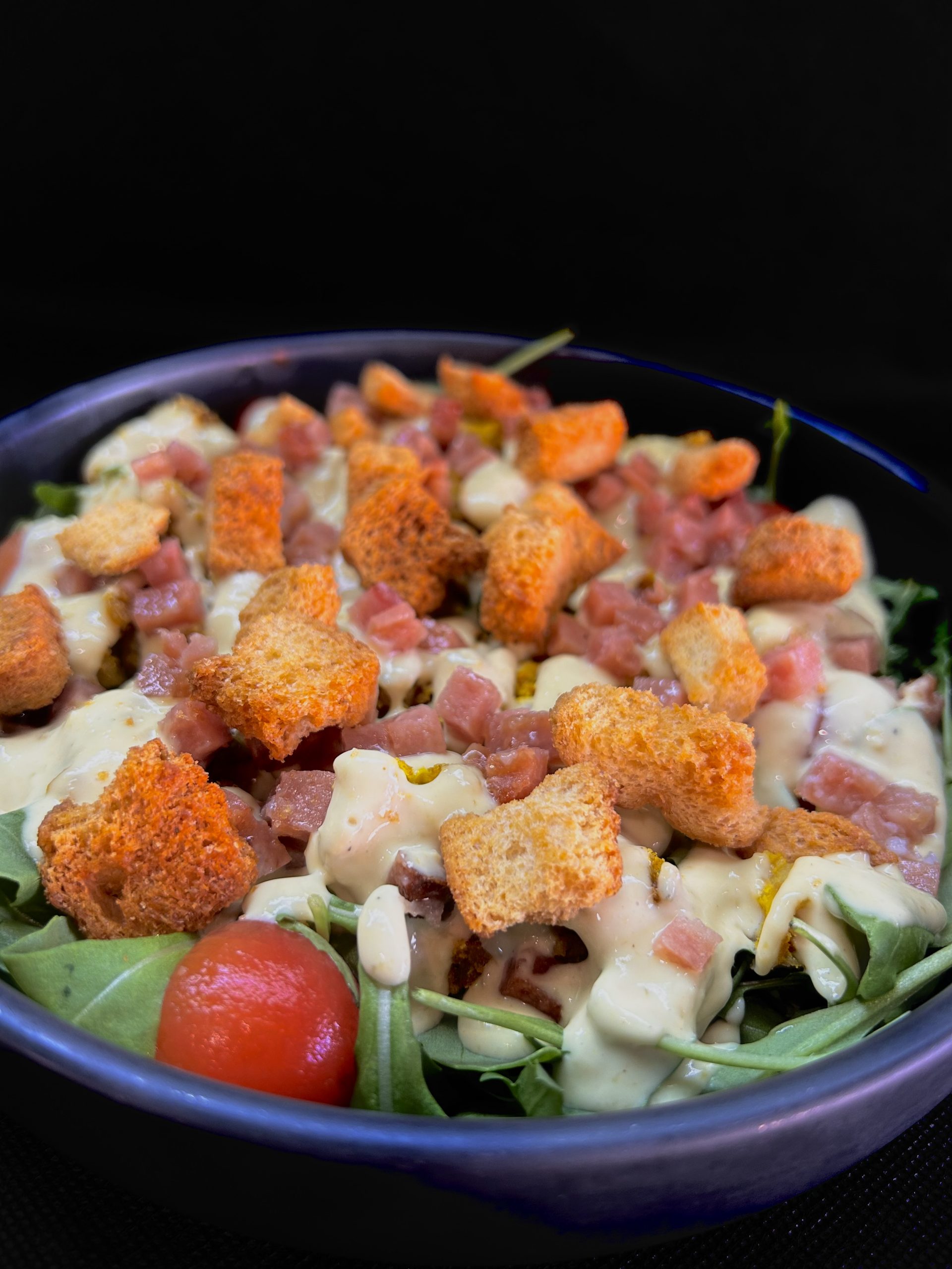 Rúcula, tomate cherry encurtido, sweet/crispy bacon, pollo frito al puro estilo Txio, salsa cesar casera y picatostes